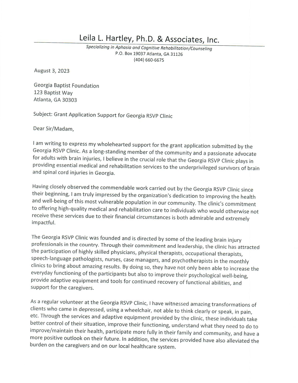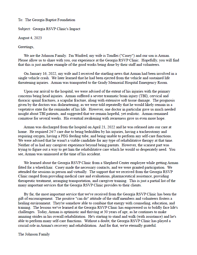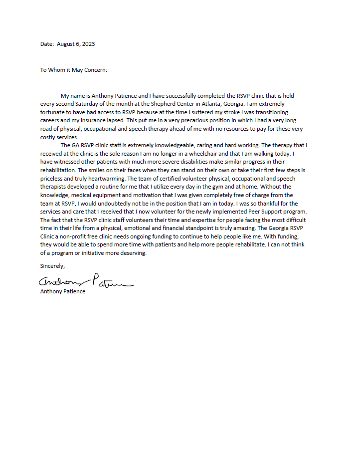 Georgia RSVP Clinic is a volunteer organization that provides comprehensive neuro rehabilitation for people with brain, stroke & spinal cord injuries on the second Saturday of each month from 7:30-1 PM.